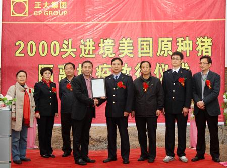放行仪式上,陕西出入境检验检疫局代表做了检疫放行报告:“经过3个多月的隔离检验,正大集团农牧食品企业(中国区)引进的2000头原种猪完全符合安全检疫标准,准予放行。”陕西出入境检验检疫局代表为正大集团陕西区陈强总裁颁发了《种猪检疫合格证书》。