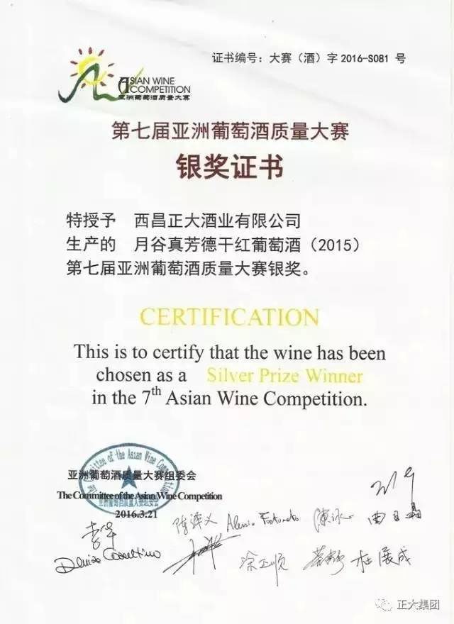 ▲正大酒业月谷干红葡萄酒荣获第七届亚洲葡萄酒质量大赛银奖