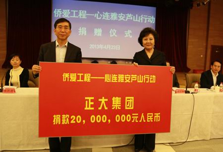 2013年4月20日8时02分,四川省雅安市芦山县发生7.0级地震。消息传来,举国震动。中国人民心连心,一方有难八方支援,全国人民与雅安人民站在一起。社会各界纷纷伸出了援助之手,对灾区进行了各种形式的捐助、支持与帮助。4月23日,正大集团为雅安地震灾区捐款人民币2000万元,集团(北京)董事长办公室杨海浩总裁代表集团出席国务院侨办举行的“侨爱工程——心连雅安芦山”行动捐赠仪式。