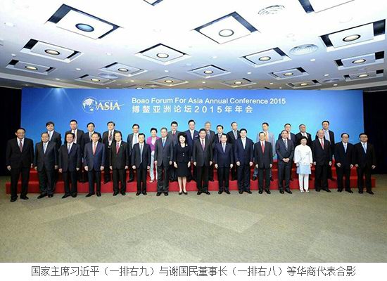 3月26-29日,博鳌亚洲论坛2015年年会在海南省博鳌举行,本届年会主题为“亚洲新未来:迈向命运共同体”。3月28日,国家主席习近平出席了年会开幕式,发表了题为《迈向命运共同体 开创亚洲新未来》的主旨演讲,并与正大集团谢国民董事长等出席博鳌亚洲论坛2015年年会的华商代表合影留念。