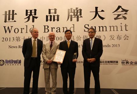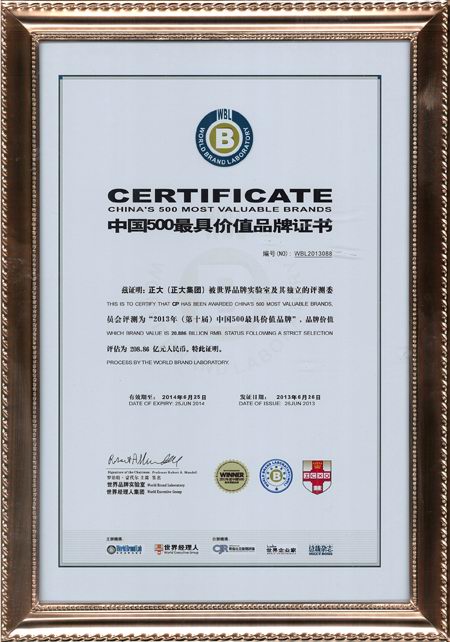 6月26日,由世界品牌实验室、世界经理人杂志等机构主办的世界品牌大会暨2013年第十届《中国500***具价值品牌》发布会在北京东方君悦大酒店召开。会议发布了2013第十届《中国500***具价值品牌》排行榜,正大集团以208.86亿元的品牌价值位居第88位。美国耶鲁大学管理学院莱维·多尔教授(右一)、法国欧洲工商管理学院琼·克劳德·拉里齐教授(左二)以及英国牛津大学商学院斯蒂芬·沃格教授(左一)为正大集团颁奖。董事长办公室(北京)杨海浩总裁(右二)代表集团接受奖杯及证书。